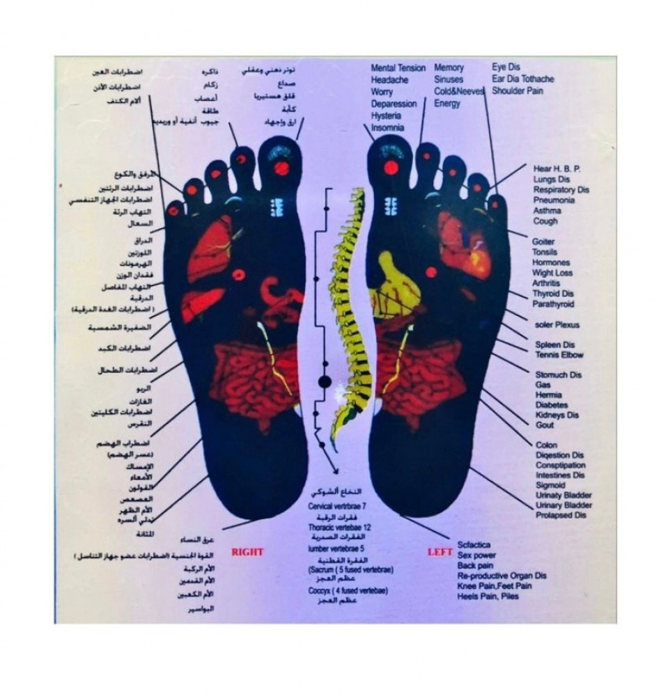 الجزء المرتفع من المفرش خاص يعمل على علاج الامساك امراض المعدة الحموضة السكري سوء الهضم ومشاكل الكلى والقلون وذالك بالمشي على الجزاء المنحني من القدم في وسط الاخمص اما المشي على الكعبين فيعالج عرق النساء آلام الساقين آلام العضلات والبواسير ومعالجة اكثر من 30 مرض