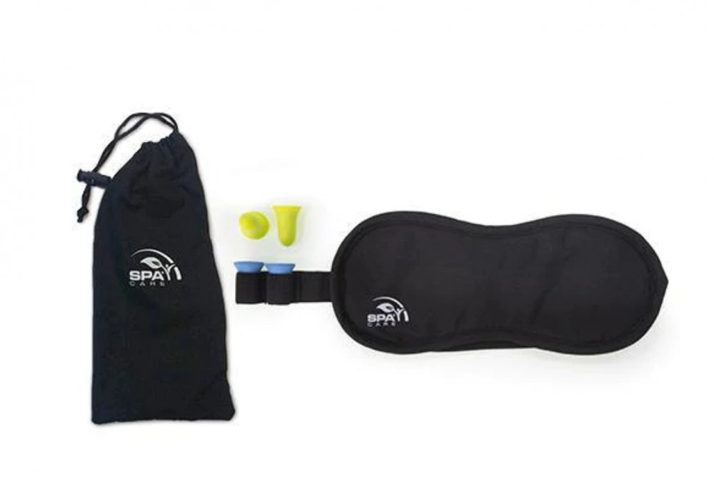 طقم من غطاء اسود بطبقة قطنية من الداخل لحجب الاضاءة عن العين وزوج من سدادة الاذن لحجب الصوت.